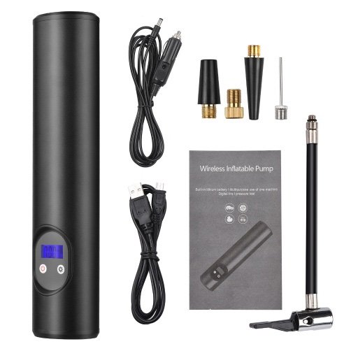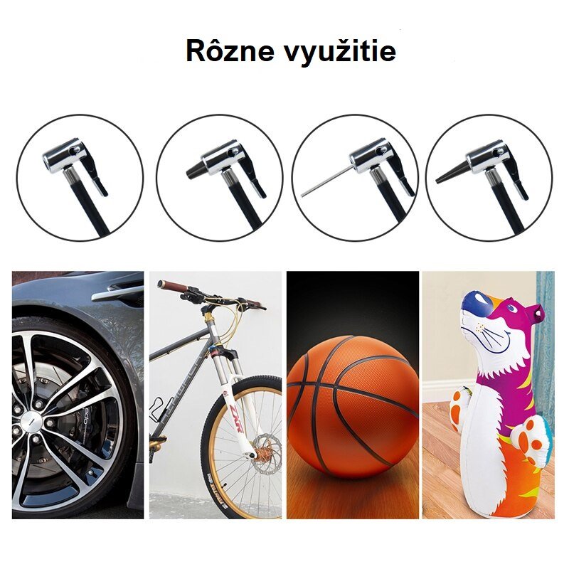 Obsah balenia: akumulátorová vzduchová pumpa, 4 nástavce (konverzný, plastový na nafukovačky, ihla na fúkanie lôpt, galúskový), hadica s nástavcom, nabíjací USB kábel, kábel na pripojenie do auta 12V, návod na používanie.