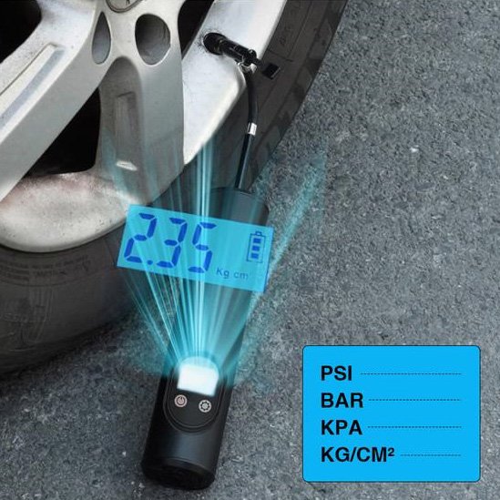 Akumulátorová vzduchová pumpa nafúka kolesá na bicykli, motocykli, dofúka kolesá na aute, ale postará sa aj o nafúkanie lôpt, nafukovacích člnov, nafukovačiek, fit lôpt a iných nafukovacých predmetov. PSI je nastaviteľné od 0-150 PSI. Merné jednotky môžete prepínať medzi PSI, kPa, BAR a Kg/cm2. Pri dosiahnutí predvoleného tlaku pumpa automaticky zastaví nafukovanie. Táto praktická pumpička obsahuje aj LED svietidlo, vďaka ktorému ju môžete využiť aj ako svietidlo v tme. Samozrejmosťou je digitálna detekcia tlaku v pneumatikách. Stav nabitia akumulátora zreteľne vidíte na veľkom LCD digitálnom displeji.