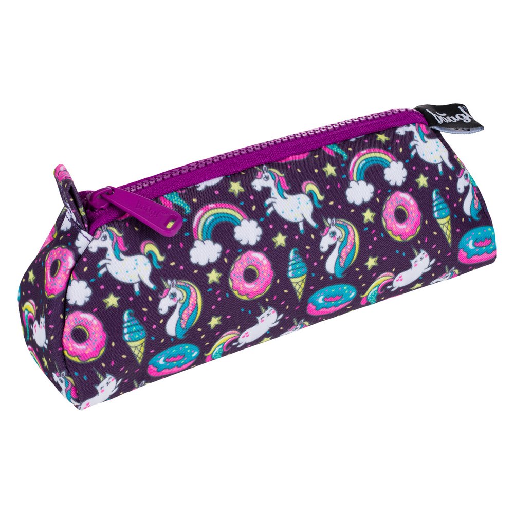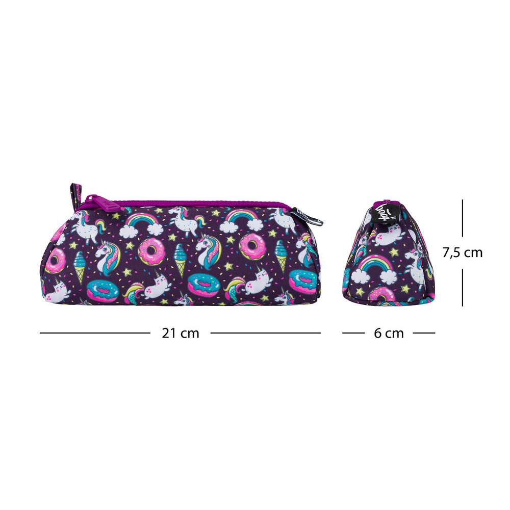 Fialové etue s potlačou jednorožcov v praktickom rozmere.