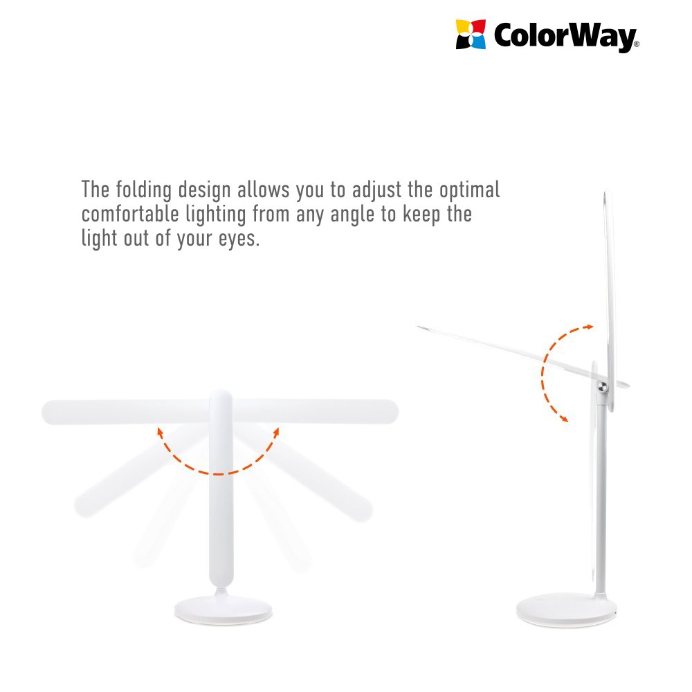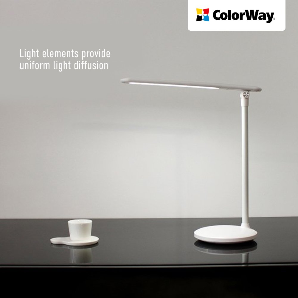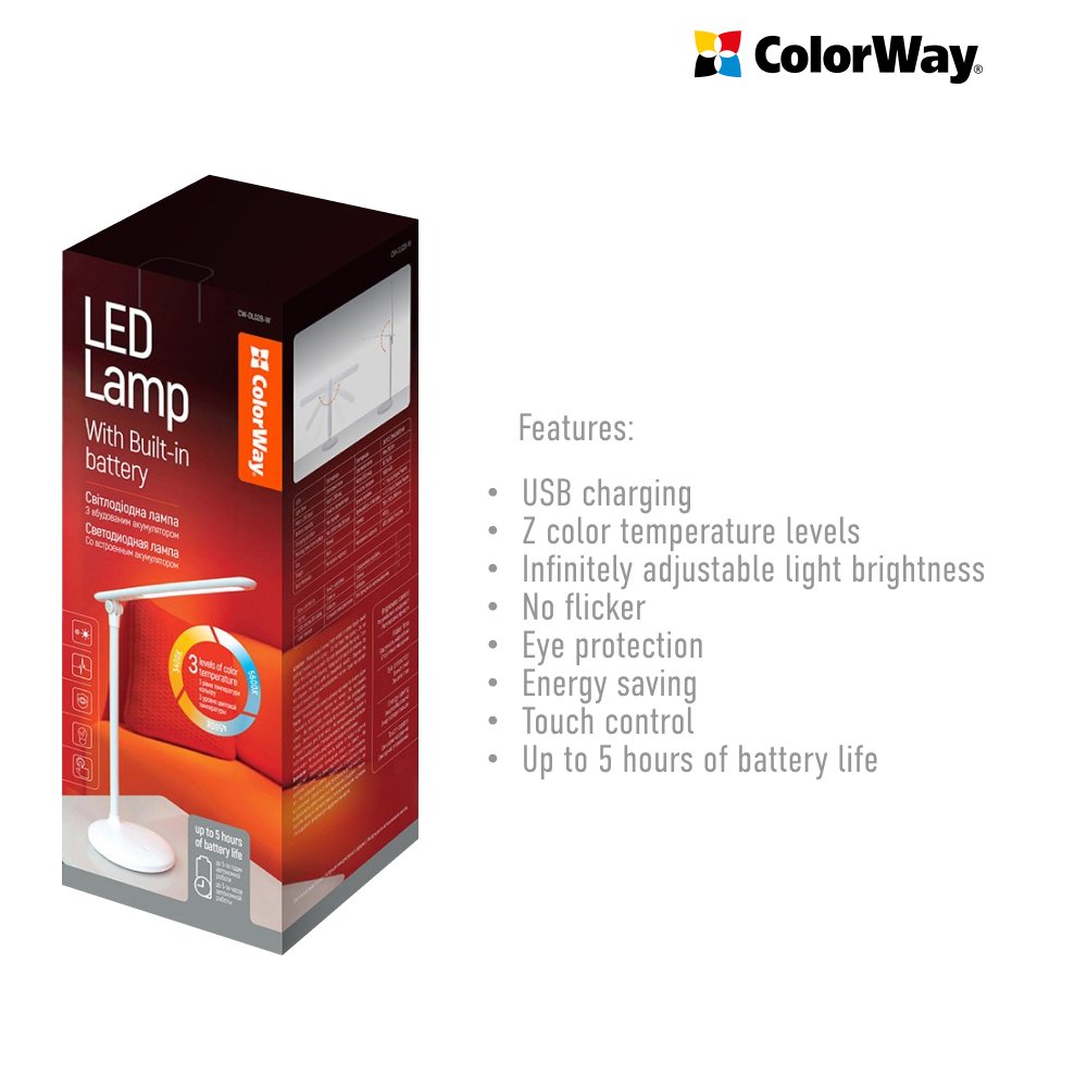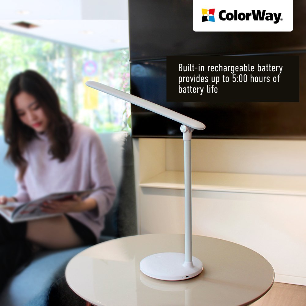 Štýlový dizajn a funkčnosť robia svietidlo ColorWay nielen elegantným prvkom interiéru, ale aj nevyhnutným doplnkom, ktorý pomáha zvyšovať produktivitu a efektivitu práce. LED lampa má zabudovanú 1 800 mAh batériu, ktorá poskytuje až 4 pracovné hodiny bez pripojenia k sieti, môžete ju nabíjať z ľubovoľného zdroja vybaveného USB konektorom! Nepotrebujete žiadne ďalšie nabíjacie zariadenia, môžete použiť konektory pre PC alebo notebook, nabíjačku pre smartphone alebo Power Bank, je to rovnake jednoduché ako nabíjanie telefónu, vďaka čomu je lampa skutočne mobilná! Dotykové tlačidlo poskytuje tiché a jemné ovládanie žiarovky. Pre zaistenie pohodlného používania môžete upraviť jas a farebnú teplotu osvetlenia. Používateľ môže podľa potreby nastaviť studené ranné svetlo, ktoré zvyšuje koncentráciu, neutrálne denné svetlo, ktoré je optimálne na čítanie a štúdium, alebo teplé žlté svetlo, ktoré upokojuje a zmierňuje stres. Svetelné prvky poskytujú rovnomerný rozptyl svetla.