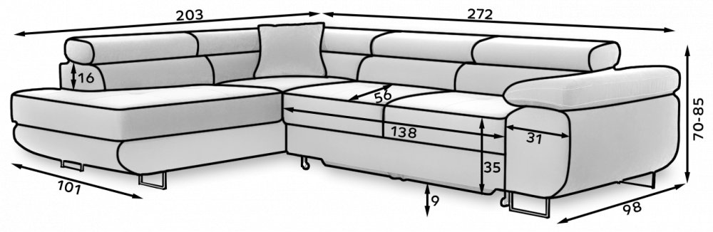 Anton je multifunkčný a priestraný rohový sedák vyrobený v Modernýom štýle. Je synonymom vysokého kvality a maximálneho pohodlia vďaka širokému sedadlu s hĺbkou 60 cm a mimoriadne elastickému penovému čalúneniu T30. Za Antonom s rozmermi 275 x 202 x 90 cm sa skrývajú aj dlhé a pohodlné noci vďaka veľkej spaciej ploche s rozmermi 125x193 cm. Nábytok má tiež priestorný úložný priestor na posteľnú bielizeň. Na maximálny pocit pohodlia má vplyv mimo iného vysoké, nastaviteľné opierky hlavy, široké 28 centimetrové lokty a 9 centimetrové kovové nohy. Ak ste zvedaví, čo ešte Anton skrýva, pozývame vás vybrať si náš rohový sedák.