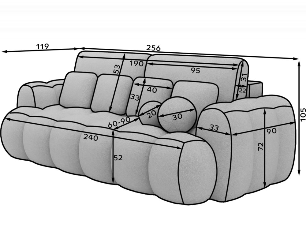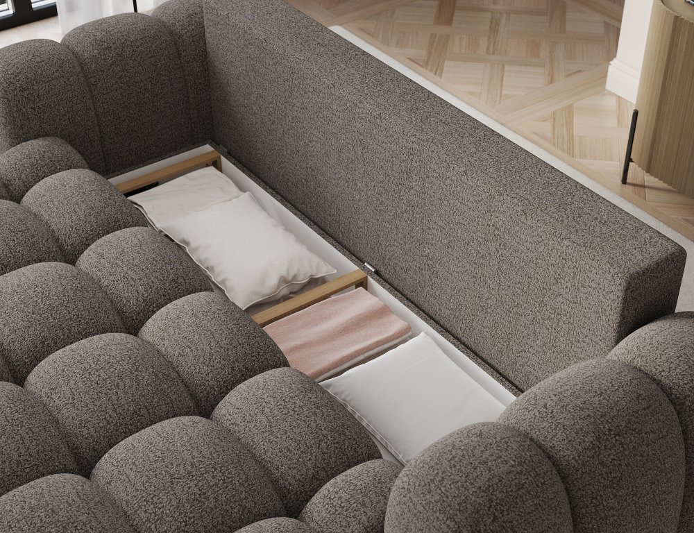 Sedačka Cotonn s rozmermi 256 x 105 x 119 cm je moderná pohovka s funkciou spania a úložným priestorom na posteľnú bielizeň, ktorá spája elegantný dizajn s výnimočným komfortom používania.Sedák je vyplnený vlnitou pružinou typu B a penami HR3030 a T2315, čo zaručuje výbornú oporu a pohodlie pri sedení aj každodennom spánku. Vďaka mechanizmu Delfín je rozkladanie pohovky rýchle a intuitívne a priestranný úložný priestor umožňuje pohodlné uskladnenie textílií.Sedačka má čierne nožičky z odolného plastu a vďaka čalúnenému chrbtu vyzerá skvele aj voľne umiestnená v strede miestnosti. Súčasťou sú dekoratívne vankúše, ktoré dodávajú útulnosť a podčiarkujú moderný charakter nábytku.Cotonn je ideálnou voľbou pre tých, ktorí hľadajú štýlovú a funkčnú sedačku do obývačky, ktorá spája estetiku, praktickosť a maximálny komfort odpočinku