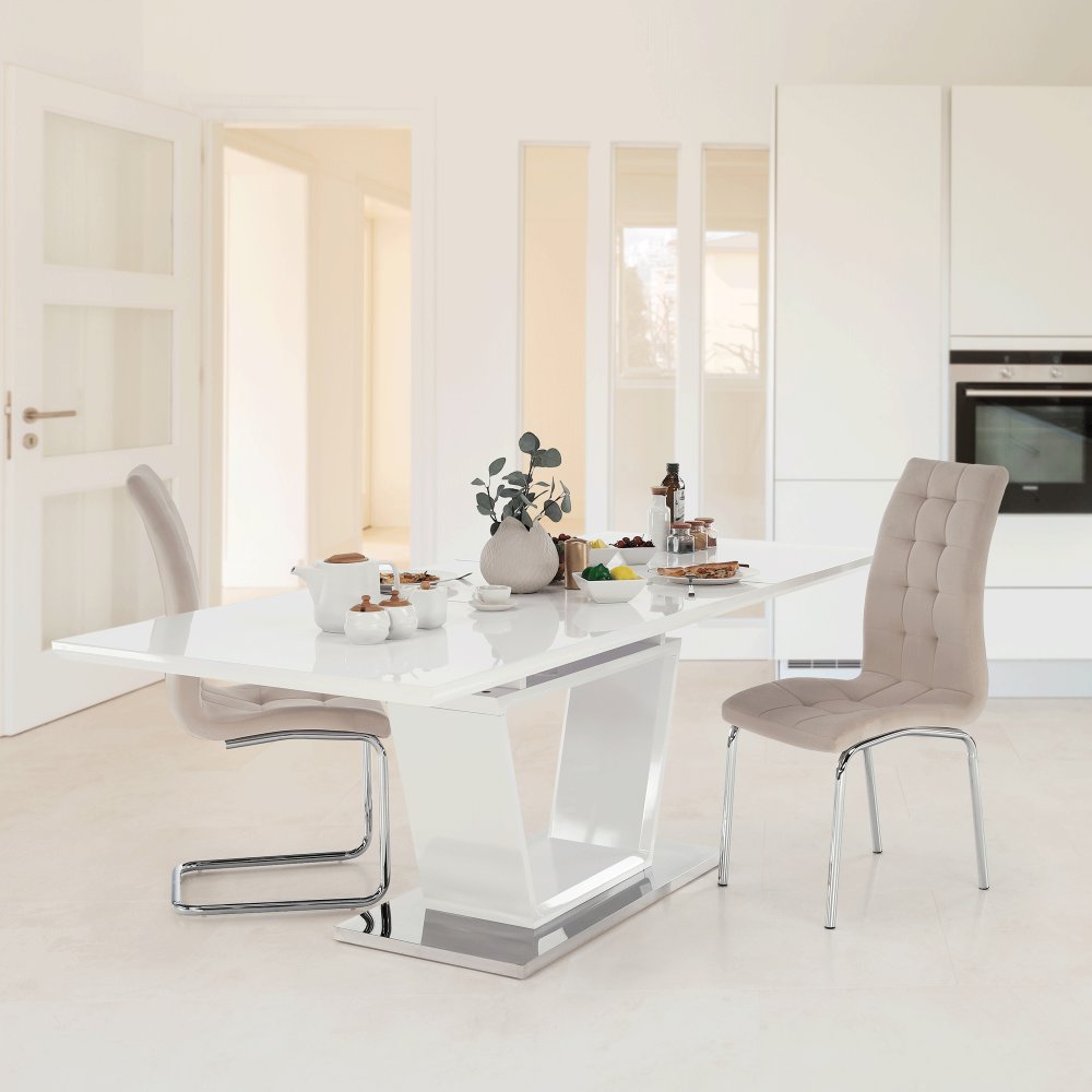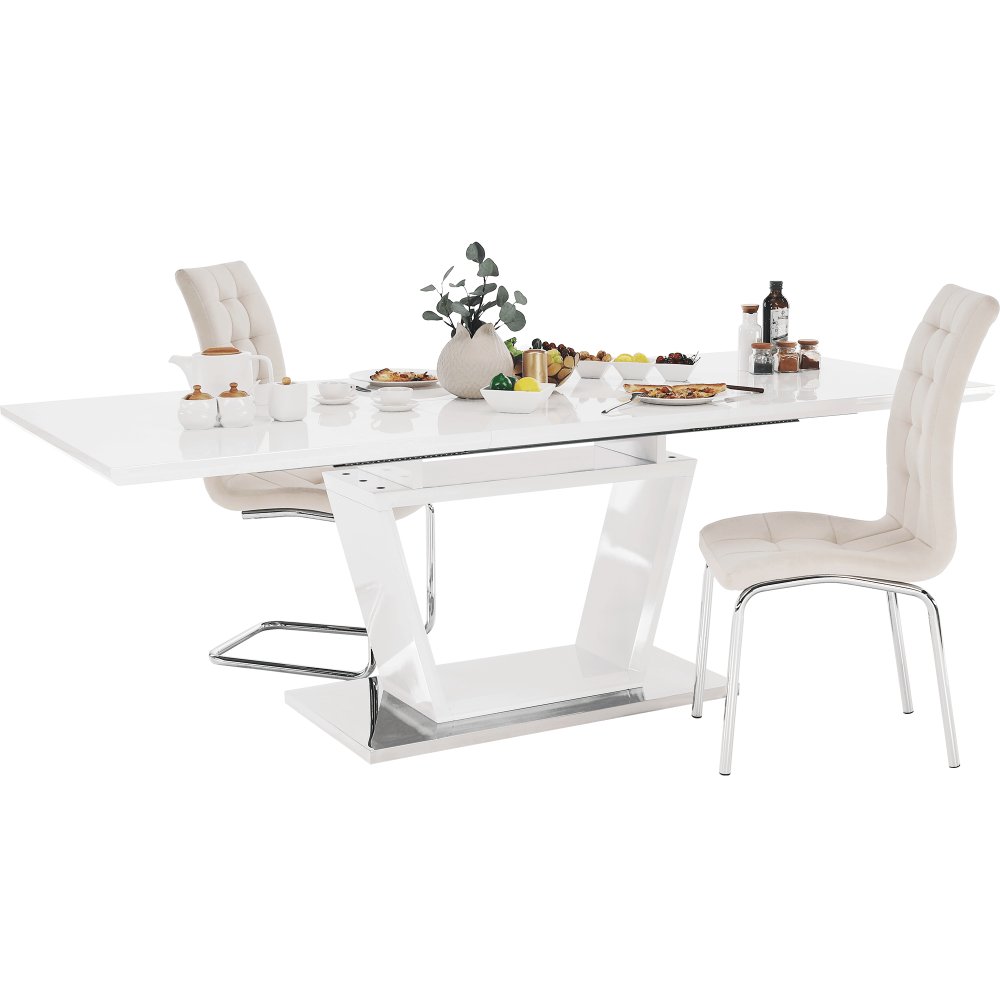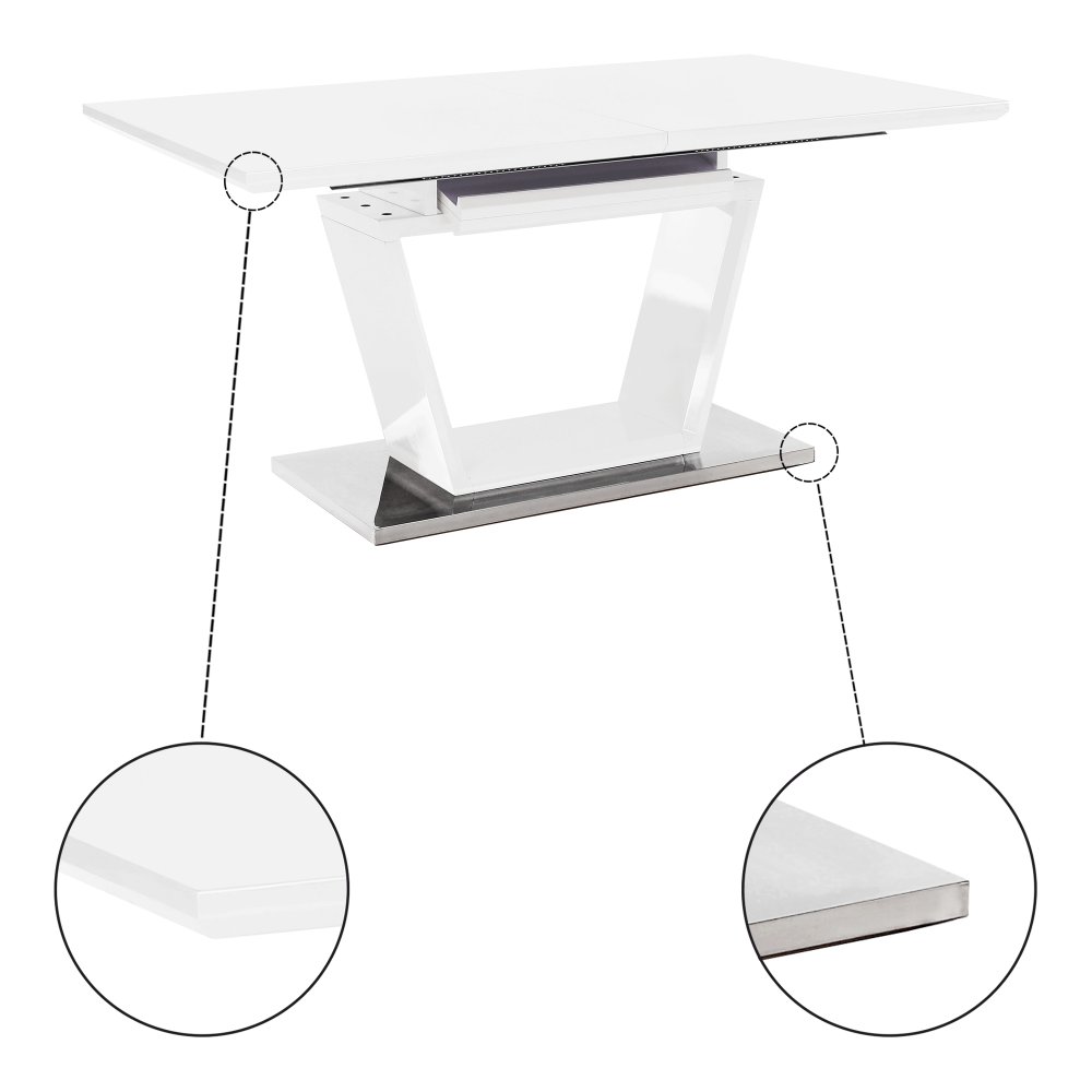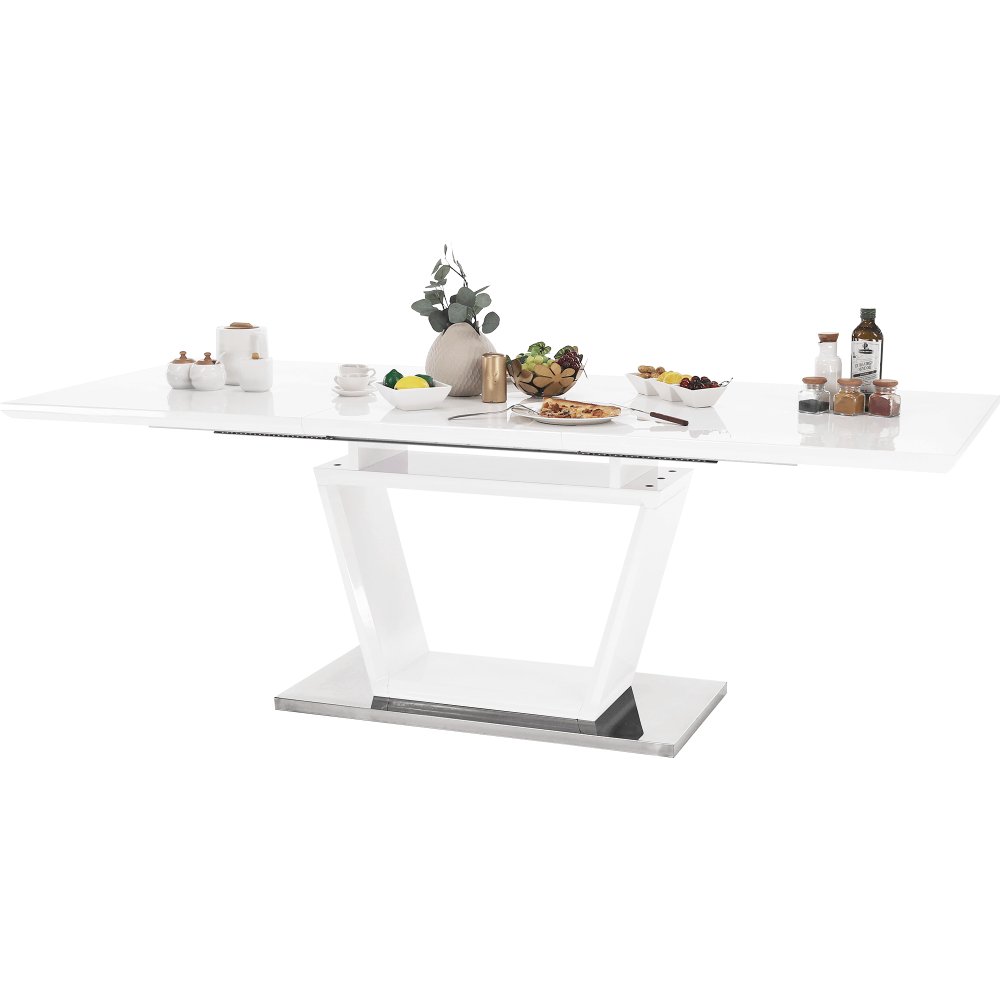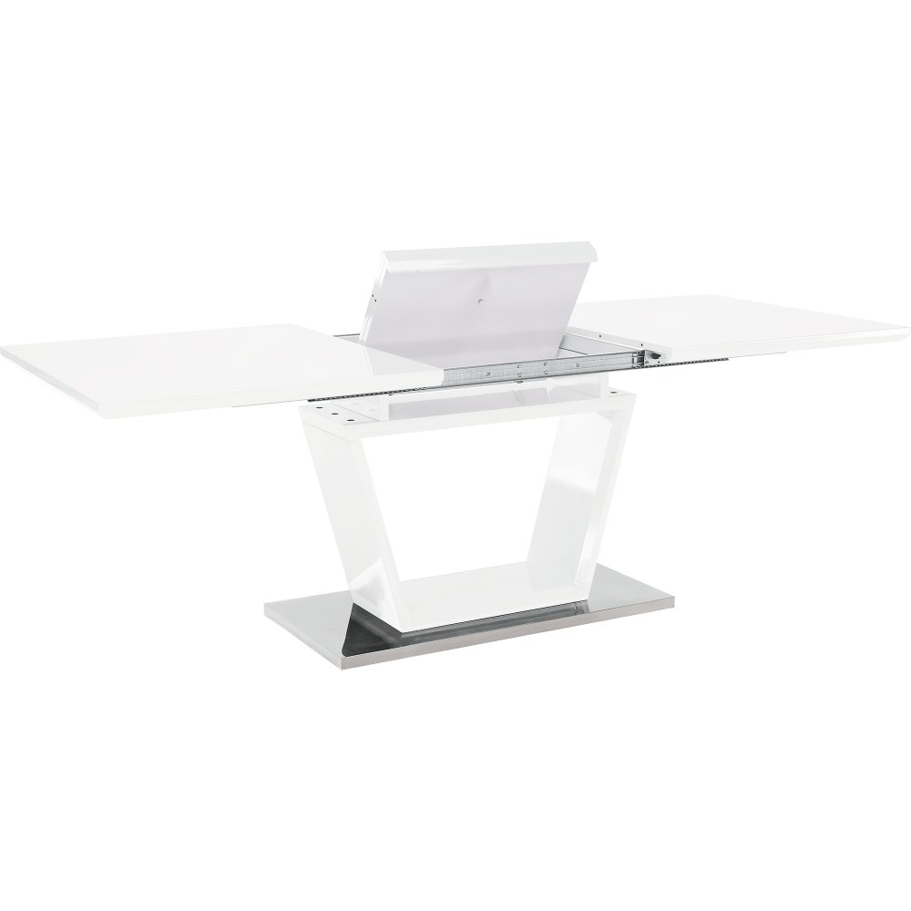 luxusný a dizajnový rozkladací jedálenský stôl, farebné prevedenie: biela s extra vysokým leskom HG, materiál: MDF+oceľ, ŠxHxV: 160-220x90x76 cm.