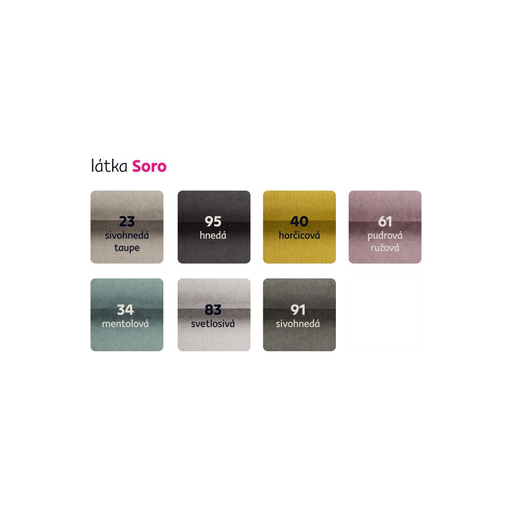 Možnosť objednania v 7 farebných prevedeniach látky Soro v cene: pohovka - 445 Eur, kreslo - 129 Eur. Pri individuálnej objednávke je potrebné zaplatiť 20% zálohu z danej sumy. Po uhradení zálohy bude Vaša požiadavka zadaná do výroby. Doba dodania 6-8 týždňov.