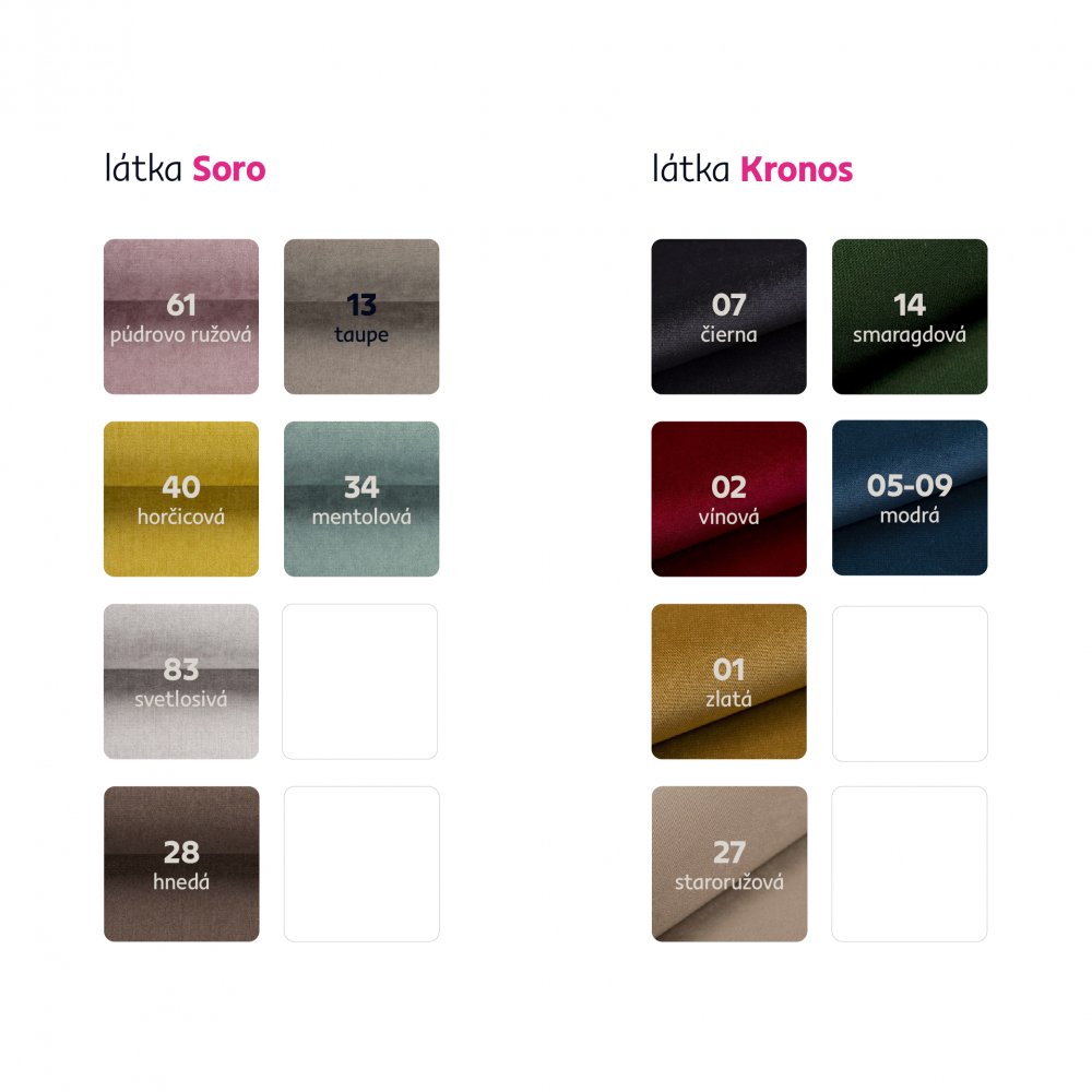 Možnosť objednania v 6 farebných prevedeniach látky Soro alebo látky Kronos, doba dodania 8-10 týždňov, cena v látke Soro a Kronos je 289 Eur. Pri individuálnej objednávke je potrebné zaplatiť 20% zálohu z danej sumy. Po uhradení zálohy bude Vaša požiadavka zadaná do výroby.