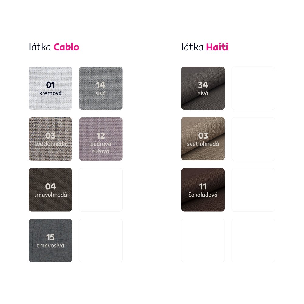 Možnosť objednania v 3 farebných prevedeniach látka Haiti alebo v 6 prevedeniach látky Cablo v cene 379 Eur. Pri individuálnej objednávke je potrebné zaplatiť 20% zálohu z danej sumy. Po uhradení zálohy bude Vaša požiadavka zadaná do výroby. Doba dodania 6-8 týždňov.