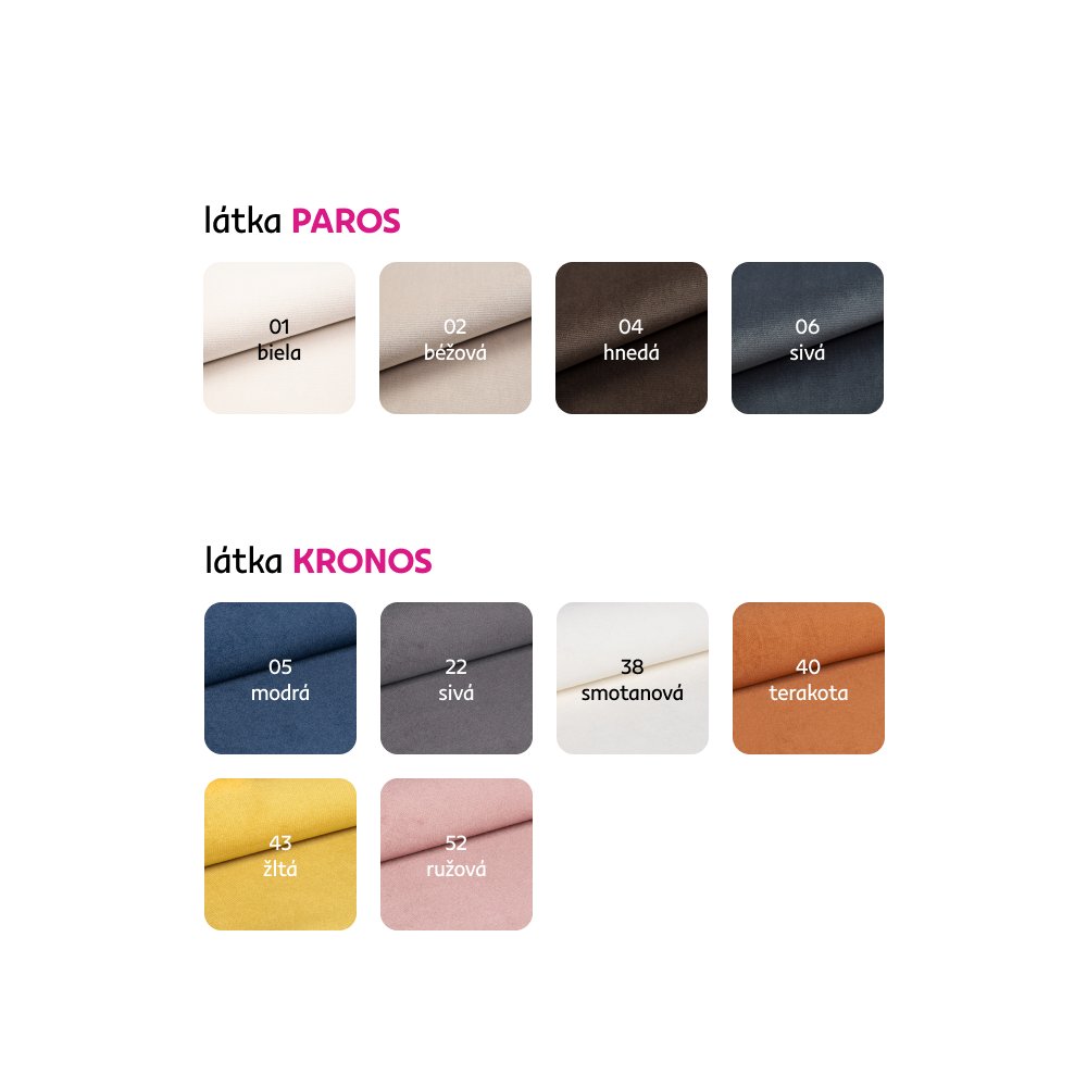 Ponúkame vám možnosť vybrať si zo 4 farebných prevedení látky Paros a zo 6 farebných prevedení látky Kronos cene 639 Eur. Pri individuálnej objednávke je potrebné zaplatiť 20% zálohu z danej sumy. Po uhradení zálohy bude Vaša požiadavka zadaná do výroby. Dodacia lehota 6-8 týždňov.