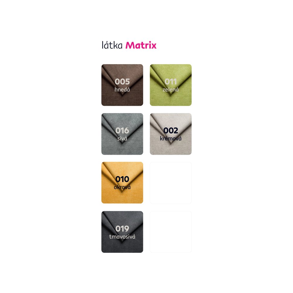 Možnosť objednania v 6 farebných prevedeniach látky Matrix v cene: roh - 1.219 Eur, kreslo - 365 Eur, taburet - 125 Eur. Pri individuálnej objednávke je potrebné zaplatiť 20% zálohu z danej sumy. Po uhradení zálohy bude Vaša požiadavka zadaná do výroby. Doba dodania 6-8 týždňov. Váš výber poznačte do poznámky v objednávke.