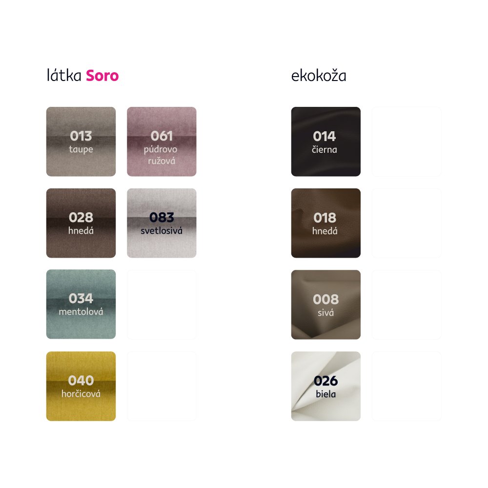 Možnosť objednania v 4 farebných odtieňoch ekokože a v 6 farebných odtieňoch látky Soro v cene 1.039 Eur. Pri individuálnej objednávke je potrebné zaplatiť 20% zálohu z danej sumy. Po uhradení zálohy bude Vaša požiadavka zadaná do výroby. Dodacia lehota 6-8 týždňov.
