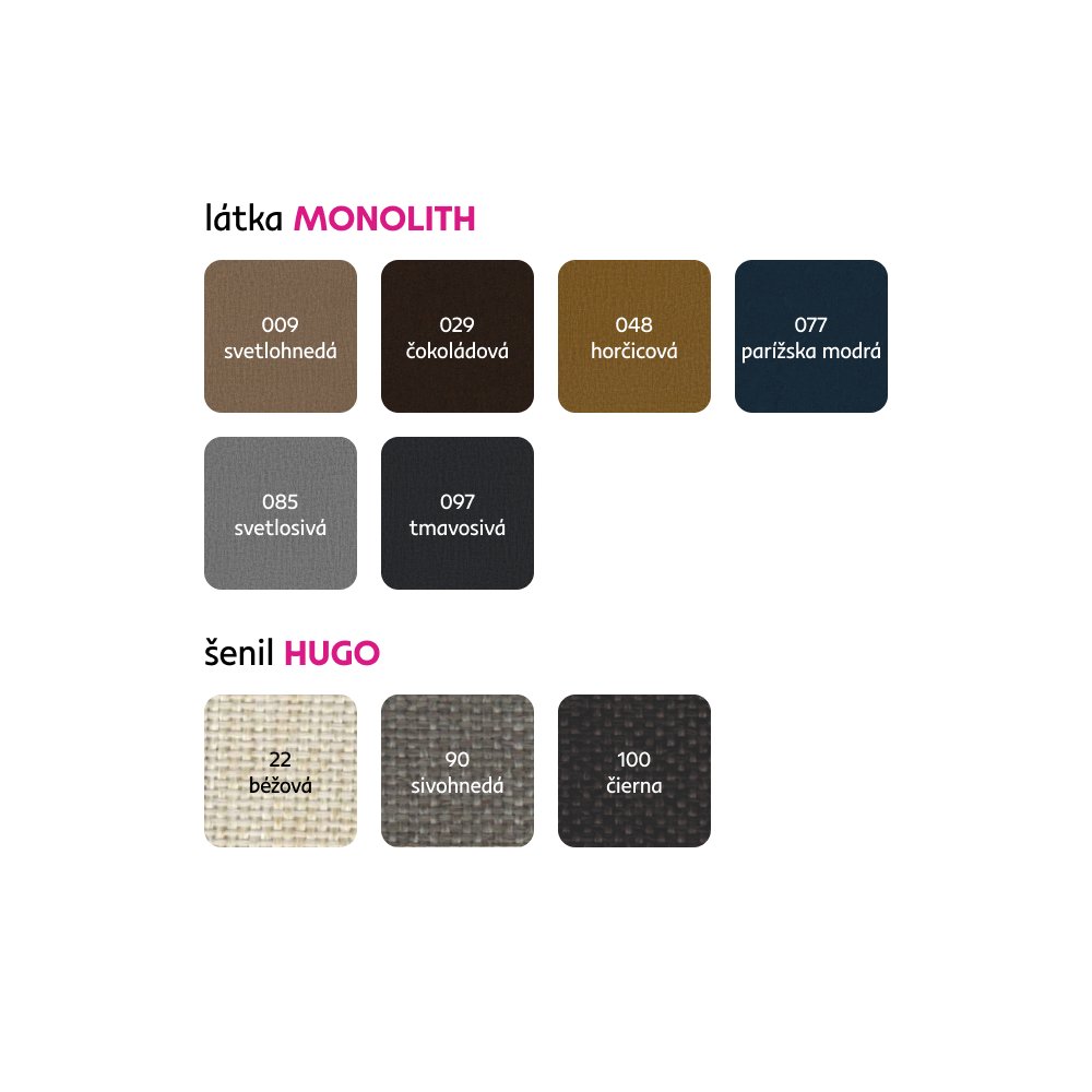 Možnosť objednania v 6 farebných prevedeniach látky Monolith a v 3 farebných prevedeniach látky Hugo v cene 1.105 Eur. Pri individuálnej objednávke je potrebné zaplatiť 20% zálohu z danej sumy. Po uhradení zálohy bude Vaša požiadavka zadaná do výroby. Doba dodania 6-8 týždňov.