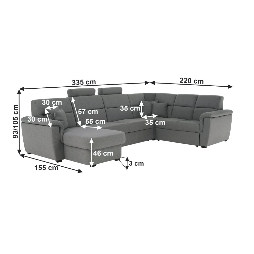 Rozmery (ŠxHxV): 335x220/155x93/105 cm, plocha na spanie (ŠxD): 125x270 cm