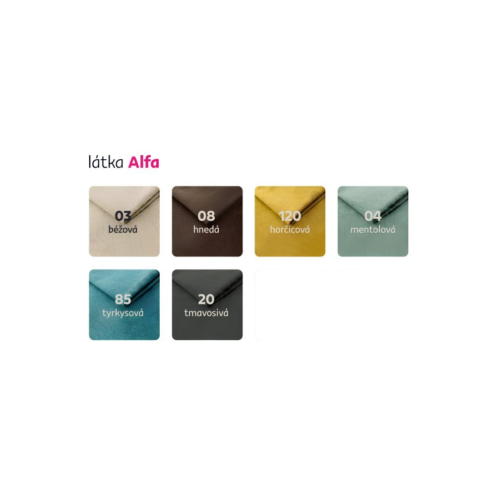 Možnosť objednania v 6 farebných prevedeniach látky Alfa v cene 839 Eur. Pri individuálnej objednávke je potrebné zaplatiť 20 % zálohu z danej sumy. Po uhradení zálohy bude Vaša požiadavka zadaná do výroby. Doba dodania 6-8 týždňov.