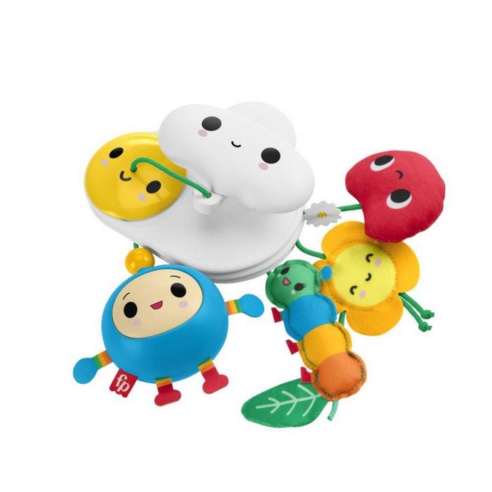 Závesná hračka kytička s mráčikom zabaví vaše maličké sa roztomilými postavičkami. Uprostred je zvoniaci objímaček s mäkkými ručičkami a nožičkami, mäkká húsenica má pri sebe list, ktorý sa dá stláčať, na kvetinke je zrkadlo a zaviazané uzlíky a mäkké hrkajúce jabĺčko s detailom kvety. Závesná hračka sa skladno skladá na jednoduché uloženie.