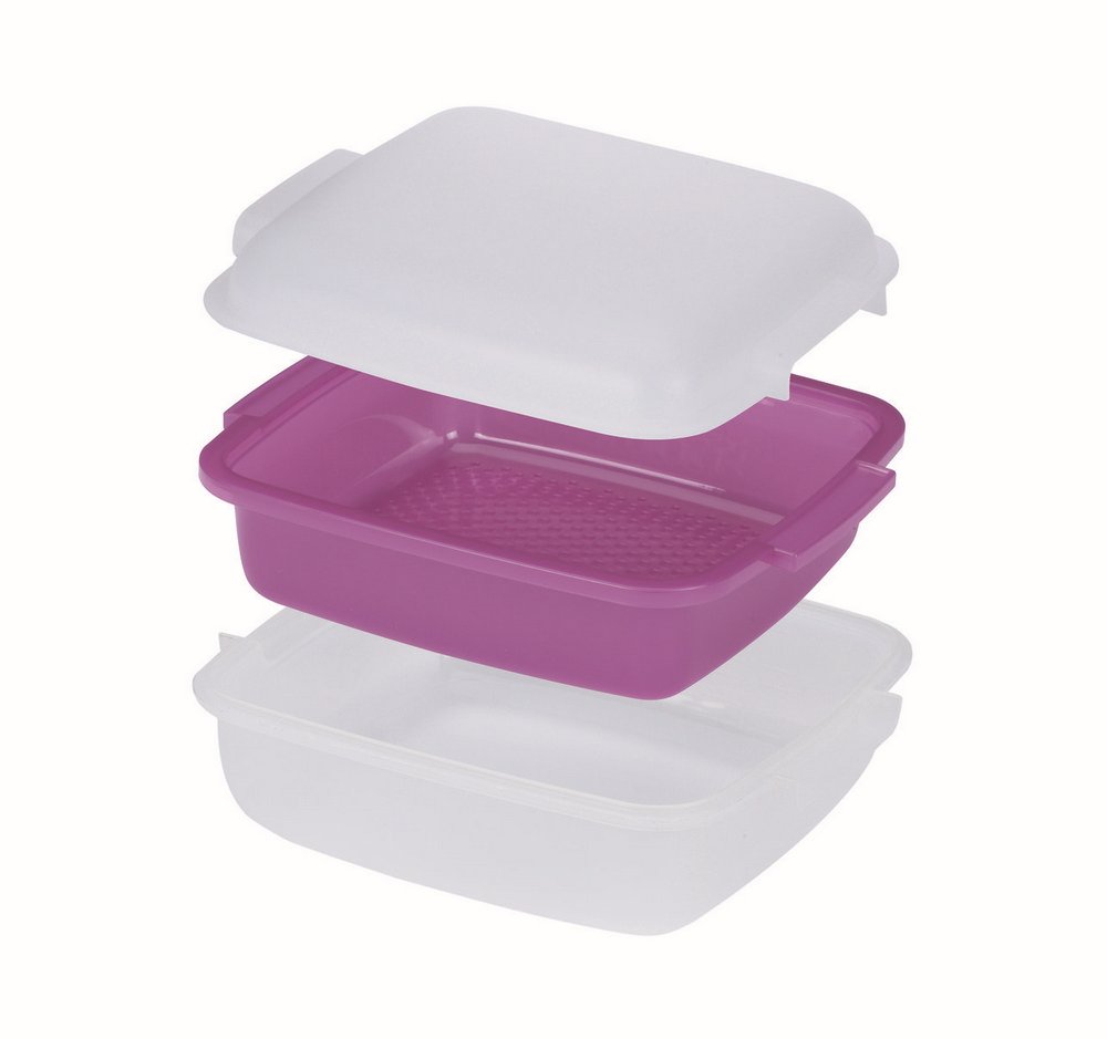 Súčasťou balenia sú 3 diely: spodný pevný, prostredný na umiestnení pokrmu a pokrievka.